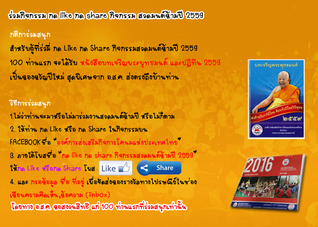 ข่าวดีสำหรับทุกท่าน หากกด like กด share กิจกรรมนี้ สำหรับ 100 ท่านแรกมีสิทธิได้รับของที่ระลึกจาก อ.ส.ค. เป็นหนังสือ บทเจริญพระพุทธมนต์ และปฏิทินปี 2559 ส่งตรงถึงบ้านท่าน