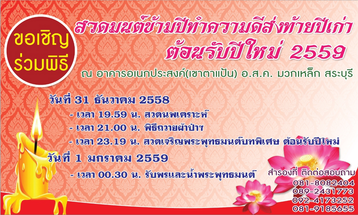 ส่งท้ายปีเก่าต้อนรับปีใหม่ 2559 ” ณ อาคารอเนกประสงค์ อ.ส.ค. อำเภอมวกเหล็ก จังหวัดสระบุรี จึงขอเชิญชวนชาว อ.ส.ค. และประชาชนทั่วไปเข้าร่วมพิธี เพื่อ