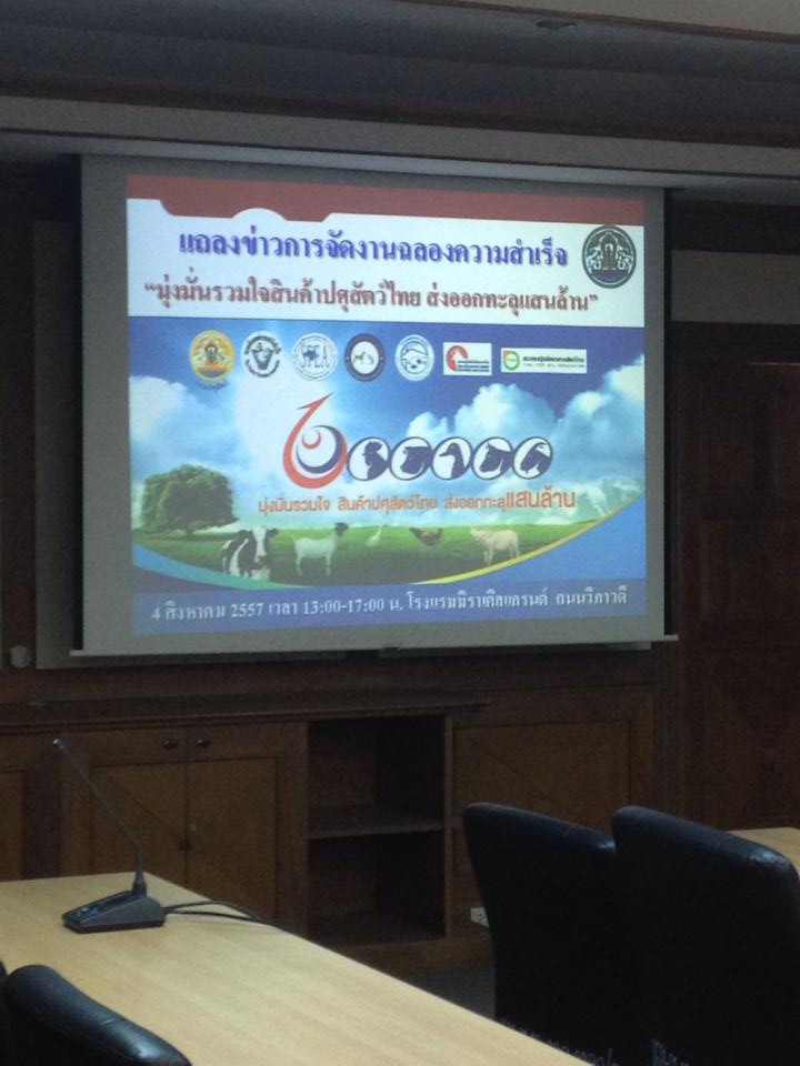 เมื่อวันที่ 30 กรกฎาคม 2557 เวลา 11.30 น. นายนพดล ตันวิเชียร รองผู้อำนวยการ อ.ส.ค.ทำการแทนผู้อำนวยการ อ.ส.ค. ได้เข้าร่วมงานแถลงข่าว “มุ่งมั่นร่วมใจ สินค้าปศุสัตว์ไทย ส่งออกทะลุล้าน” ณ ห้องประชุม 2 ตึกชัยอัศวรักษ์ สหกรณ์ออมทรัพย์กรมปศุสัตว์ โดยมีอธิบดีกรมปศุสัตว์ นายสัตวแพทย์ทฤษดี ชาวสวนเจริญ เป็นประธานเปิดงานแถลงข่าว และในวันที่ 4 สิงหาคม 2557 กรมปศุสัตว์ร่วมกับสมาคมต่างๆในภาคปศุสัตว์ ได้ร่วมกันจัดนิทรรศการในงานดังกล่าว ณ ห้องแกรนด์บอลรูม โรงแรมมิลาเคิลแกรนด์คอนเวนชั่น กรุงเทพฯ จึงขอเรียนเชิญทุกท่านเข้าร่วมงานได้ตามวัน เวลา ดังกล่าวนี้