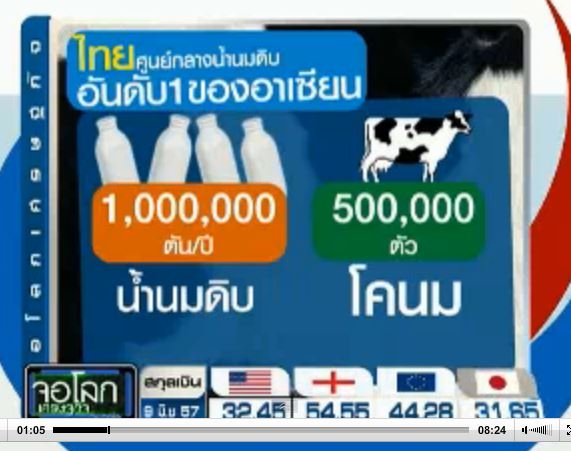 ติดตามรับชมคลิปข่าว เมื่อวันที่ 9 มิถุนายน 2557 จอโลกเศรษฐกิจ เด่น รายการข่าวเศรษฐกิจทางช่อง 3 ได้นำเสนอข่าว การจัดการฟาร์มโคนมไทย,การจัดการฟาร์มโคนมขนาดใหญ่ของเวียดนาม,มาตรฐานการจัดการฟาร์มโคนมเวียดนาม