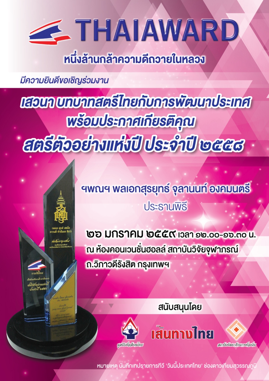 ตามที่ อ.ส.ค. ได้ส่งประวัติผลงานของนางกัญญา สงวนสุข เลาขานุการฝ่ายวิจัยเละพัฒนาการเลี้ยงโคนม เข้าร่วมพิจารณาคัดสรรให้ได้รับรางัล “สตรีตัวอย่างเเห่งปี” ประจำปี 2558 และได้รับประกาศเกียรติคุณรางวัล “สตรีตัวอย่างแห่งปี” ประจำปี 2558 สาขาบริหารจัดการ จากมูลนิธิเพื่อสังคมไทย รางวัลไทย เมื่อวันที่ 26 มกราคม 2559 ณ ห้องคอนเวนชั่นฮอลล์ ศูนย์ประชุมวิจัยจุฬาภรณ์ ถนนวิภาวดีรังสิต กรุงเทพฯ โดยมีท่าน พลเอกสุรยุทธ์ จุลานนท์ องคมนตรี