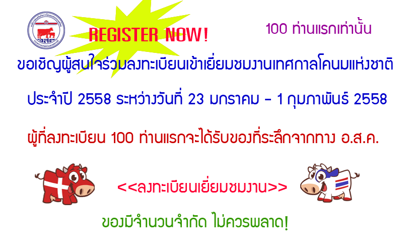 ขอเชิญทุกท่านลงทะเบียนเที่ยวงานเทศกาลโคนมแห่งชาติ ประจำปี 2558 โดยผู้ที่ลงทะเบียน 100 ท่านแรก จะได้รับของที่ระลึกจากทาง อ.ส.ค. ส่วน 101-300 จะได้รับผลิตภัณฑ์นมไทย-เดนมาร์ค