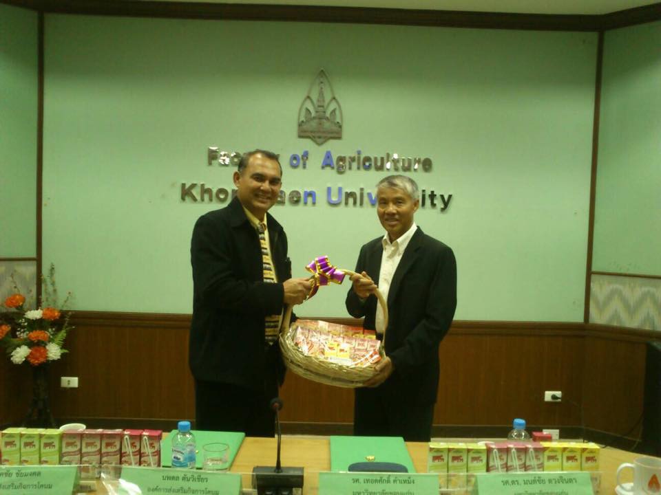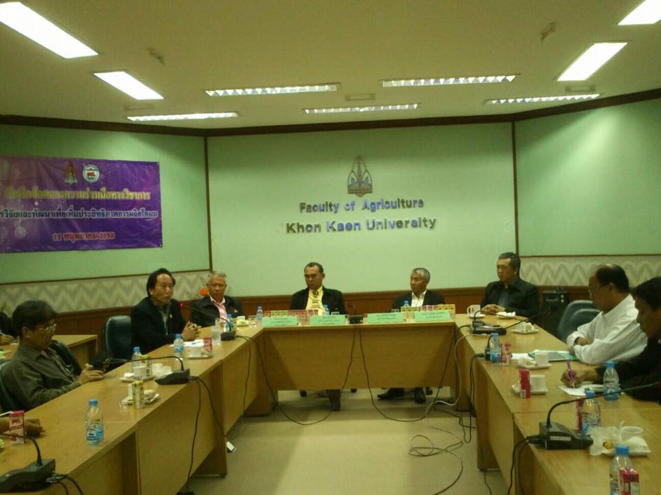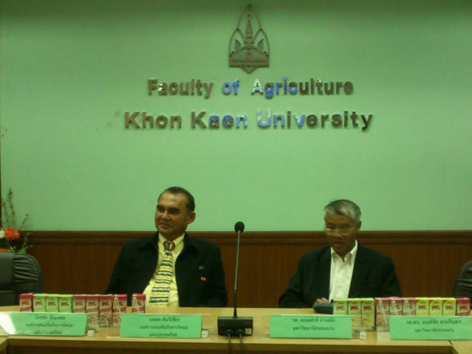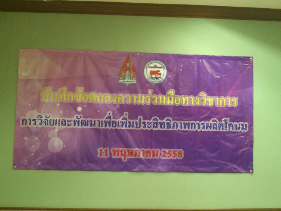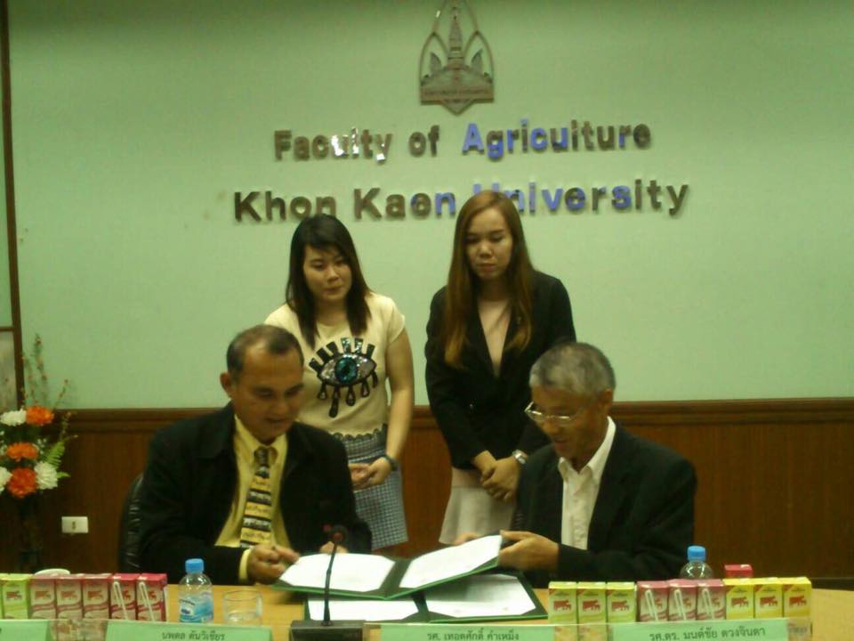 วันนี้ (๑๑ พฤษภาคม ๒๕๕๘) อ.ส.ค. โดยนายนพดล ตันวิเชียร รองผู้อำนวยการ ทำการแทนผู้อำนวยการ ได้ลงนามบันทึกข้อตกลงความร่วมมือทางวิชาการ กับภาควิชาสัตวศาสตร์ คณะเกษตรศาสตร์ มหาวิทยาลัยขอนแก่น (มข.) โดยมี รองศาสตราจารย์ เทอดศักดิ์ คำเหม็ง หัวหน้าภาควิชาสัตวศาสตร์ คณะเกษตรศาสตร์ มหาวิทยาลัยขอนแก่น ในเรื่อง “การวิจัยและพัฒนาเพื่อเพิ่มประสิทธิภาพการผลิตโคนม” ณ ภาควิชาสัตวศาสตร์ โดยมีวัตถุประสงค์เพื่อเพิ่มประสิทธิภาพด้านการเลี้ยงโคนม และการพัฒนาอาชีพการเลี้ยงโคนมที่ยั่งยืน ซึ่งผลงานวิจัยที่ได้ก็จะนำไปถ่ายทอดสู่เกษตรกรผู้เลี้ยงโคนม โดยในงานมีคณะผู้บริหารที่กำกับดูแลด้านกิจการโคนม นำโดย น.สพ. โชคชัย ชัยมงคล ผู้ช่วยผู้อำนวยการ และพนักงานในสังกัดฝ่ายวิจัยและพัฒนาการเลี้ยงโคนม ผู้บริหาร พนักงานสำนักงาน อ.ส.ค.ภาคตะวันออกเฉียงเหนือ และคณาจารย์จากภาควิชาสัตวศาสตร์ คณะเกษตรศาสตร์ มหาวิทยาลัยขอนแก่น ร่วมเป็นสักขีพยานในความร่วมมือทางวิชาการในครั้งนี้