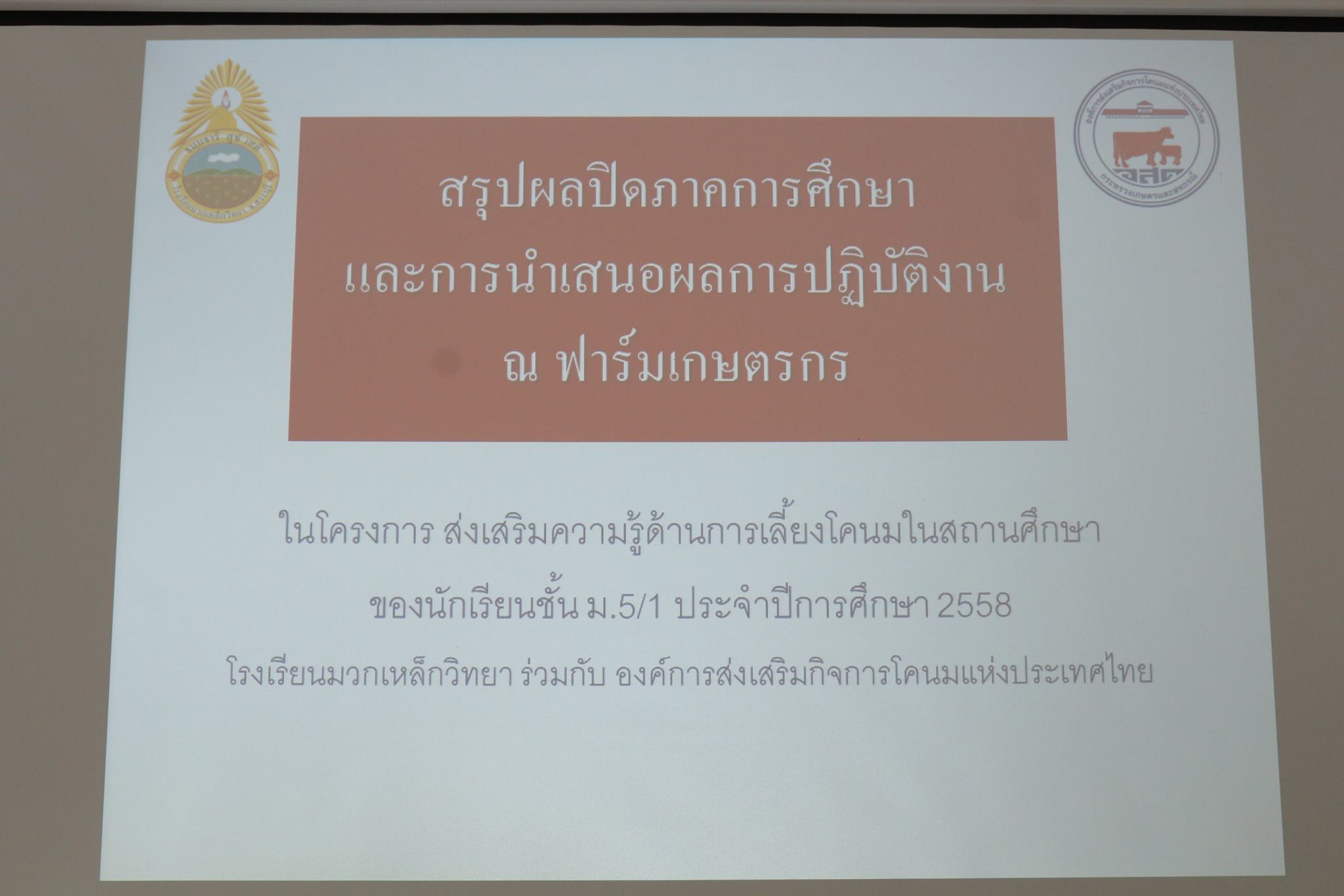 เมื่อวันที่ ๑๑ กันยายน ๒๕๕๘ อ.ส.ค. ได้ร่วมกับโรงเรียนมวกเหล็กวิทยา จัดกิจกรรมปิดภาคการศึกษาและนำเสนอผลการปฎิบัติงานในฟาร์มเกษตรกร “โครงการส่งเสริมความรู้ด้านการเลี้ยงโคนมในสถานศึกษา ประจำปี ๒๕๕๘” ซึ่งเป็นโครงการเพื่อสังคมที่ อ.ส.ค. จัดร่วมกับโรงเรียนมวกเหล็กวิทยา ติดต่อกันมาเป็นเวลา ๔ ปี เพื่อให้นักเรียนในเขตพื้นที่การเลี้ยงโคนมมีความรู้ความเข้าใจและสืบทอดอาชีพการเลี้ยงโคนม กิจกรรมดั่งกล่าวมีนักเรียนเข้าร่วมจำนวน ๓๕ คน โดยอบรมทุกวันศุกร์ๆละประมาณ ๒ ชั่วโมง เป็นเวลา ๔ เดือนเริ่มตั้งแต่ปลายดือน พฤษภาคม ๒๕๕๘ เป็นต้นมา